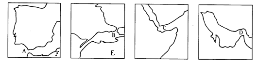 (2)沟通阿拉伯海和红海的海峡是图中代号  ;沟通地中海和大西洋的海峡是        ,代号是  ;跨越两大洲又位于同一个国家内的海峡是       ,图中代号是  ;周围沙漠气候广布,附近又盛产石油的海峡是图中代号