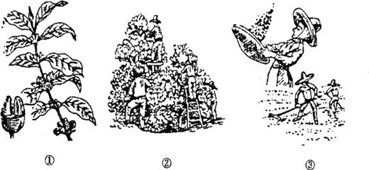 43.下面一组图中,图①是一种经济作物,图②是采摘该作物的果子,图③是对果子进行精选和晒干,最后将其磨成粉,主要做饮料用。回答下列问题(6分)