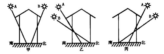 下图反映了三座不同纬度地区的房屋二至日阳光照射情况,图中A或B表示夏至和冬至。读图回答11~12小题: