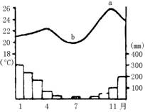 图二表示某地气温(曲线所示)和降水(柱状所示)的年平均状况,回答8~10题: