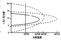 20、图八中①②③④四根曲线分别表示四地6月22日太阳高度的全天变化情况。判断四地纬度位置与图示相符合的是