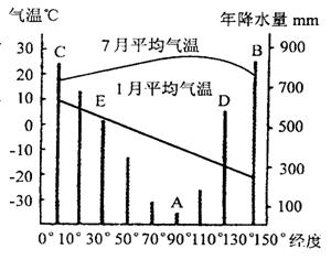 36、图十九是沿40°N亚欧大陆及附近地区1月和7月温度变化曲线和各地年降水量分布图,读图后回答下列问题:(20分)