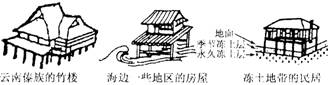 35、(15分) 由于云南傣族居住的地区气候终年湿热;竹楼高架起来可以防潮、防野生动物袭击,并利于通风。海边一些地区的房屋高架起来,主要减少风浪的破坏程度。冻土地带房屋桩基打在永久冻土层上,比较稳固;房屋高架在地面上,利于通风,可防寒,减少积雪堆积。