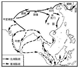 (4)我国敦煌石窟记载了佛教从_______到_______在这里的分布和发展。