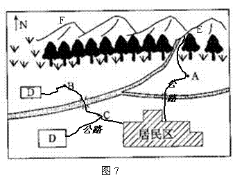 31.读图7,某城市位于河边,该河上游水深流急,北有高山,森林茂密。D为工业区,当地盛行东北风,回答问题。(9分)