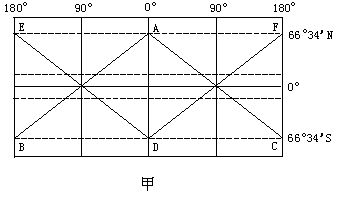 (3)在乙图中绘出当甲图DF为昏线时的光照情况(绘太阳光线、晨昏线,用斜线标出夜半球),并判断乙图中G点太阳高度_______________,其依据是_______________。