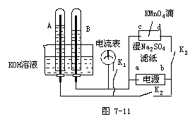 例5 图7-11所示,A与B试管中的电极为多孔的惰性电极;c和d为夹在湿的Na2SO4滤纸条上的铂夹;电源有a和b两极。若在A和B试管中充满KOH溶液后倒立于KOH溶液的水槽中。切断K1,合闭K2和K3,通过直流电,则: