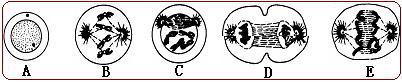 (1)图中A-E的细胞图象表示细胞分裂间期、前期、中期、后期、末期的字母依次是