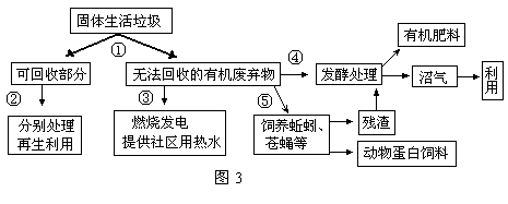 (3)垃圾实在是被人们放错了地方的资源,实现垃圾的“减量化、资源化和无害化”是绿色城市的重要标志之一。图3是垃圾资源化、无害处理的一种方案,此方案中①、②过程需要每一位市民的参与,我们参与的行动方式是 。④、⑤过程利用的生物隶属于生态系统的何种成分? 。从对资源的充分利用角度分析,④、⑤途径比③途径的优点是 。